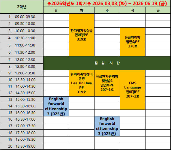 강의자료실 강의시간표 강의시간표Home강의자료실강의시간표 2026-1학기 2학년 시간표 작성자 : 학과관리자 | 작성일 : 2026.03.05 | 조회수 : 38 첨부파일 2026-1학기 2학년 시간표.png 목록 이전글 2026-1학기 3학년 시간표 다음글 2026-1학기 1학년 시간표