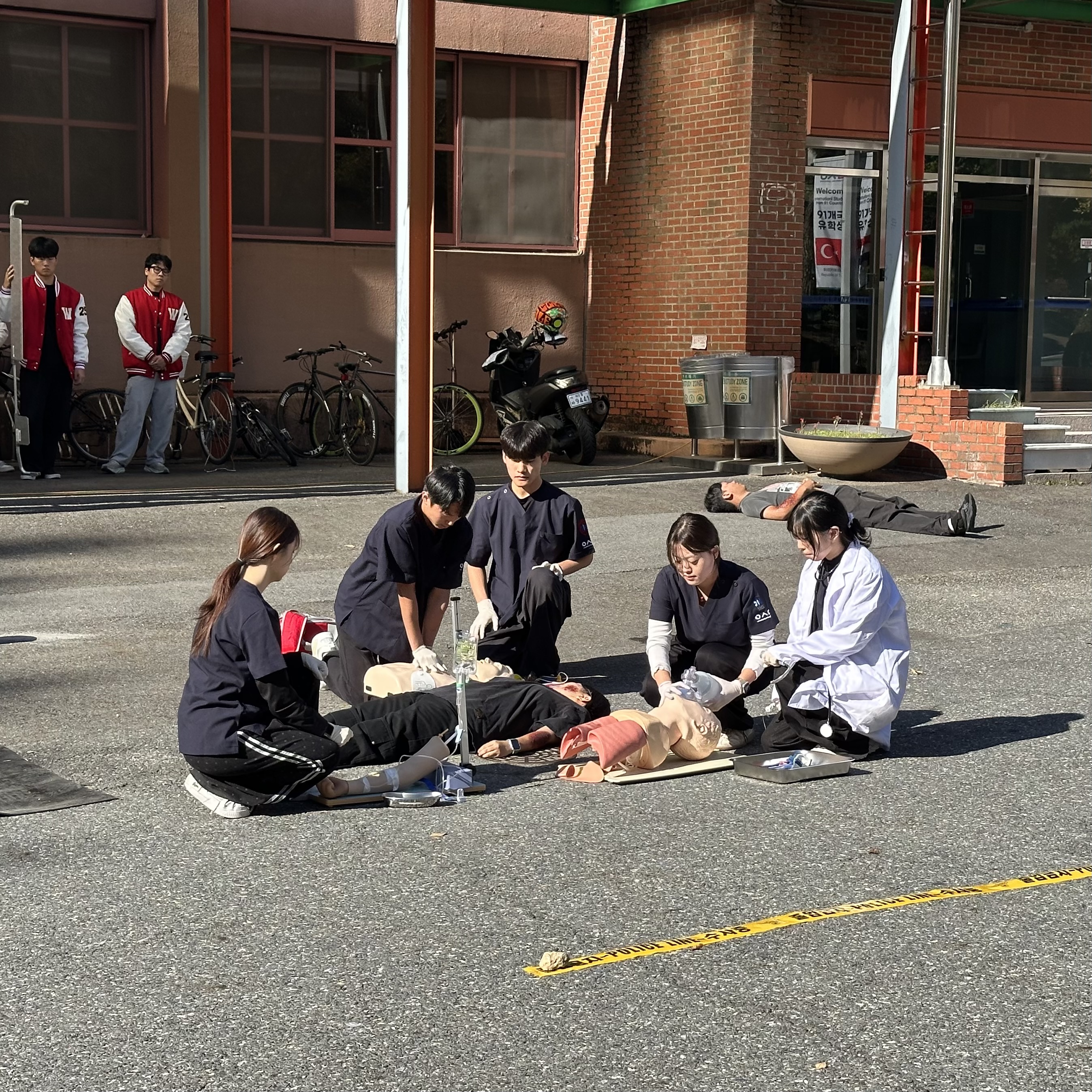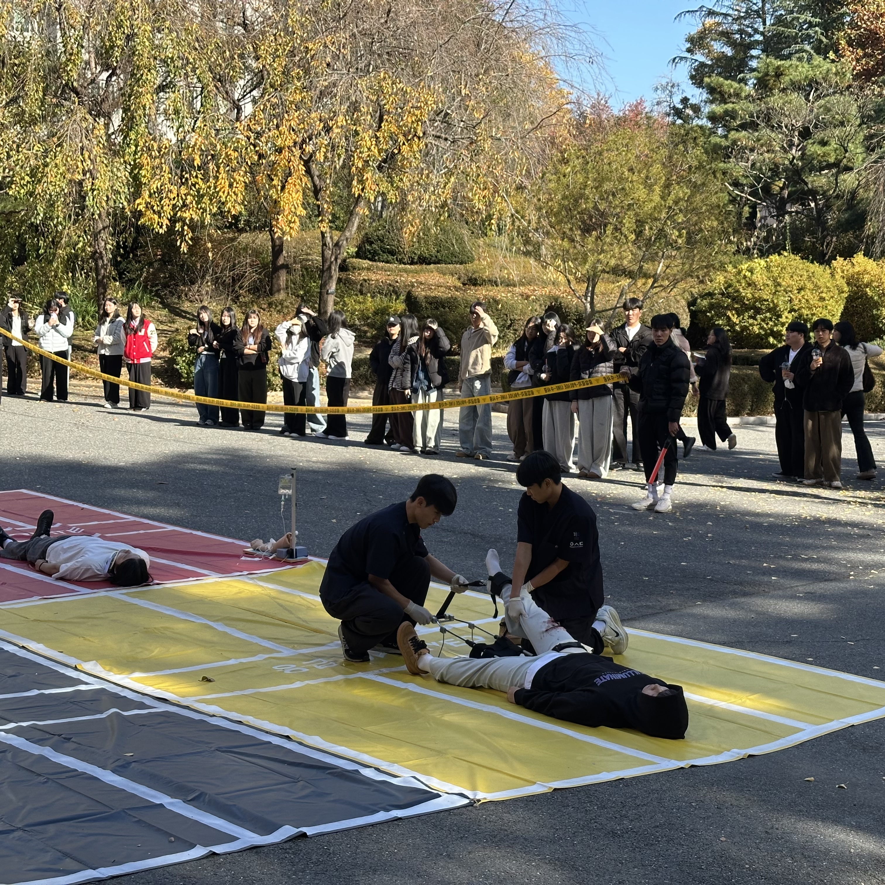 1부는 대량재해 사고를 주제로 DMAT팀의 역할과 중요성 인식 및 재학생들의 사고 대응능력 향상에 목적을 둔 시나리오 공연을 선보였습니다. 재학생들의 꾸준한 연습으로 술기를 더 자세히 선보일 수 있는 시간이 되었습니다.