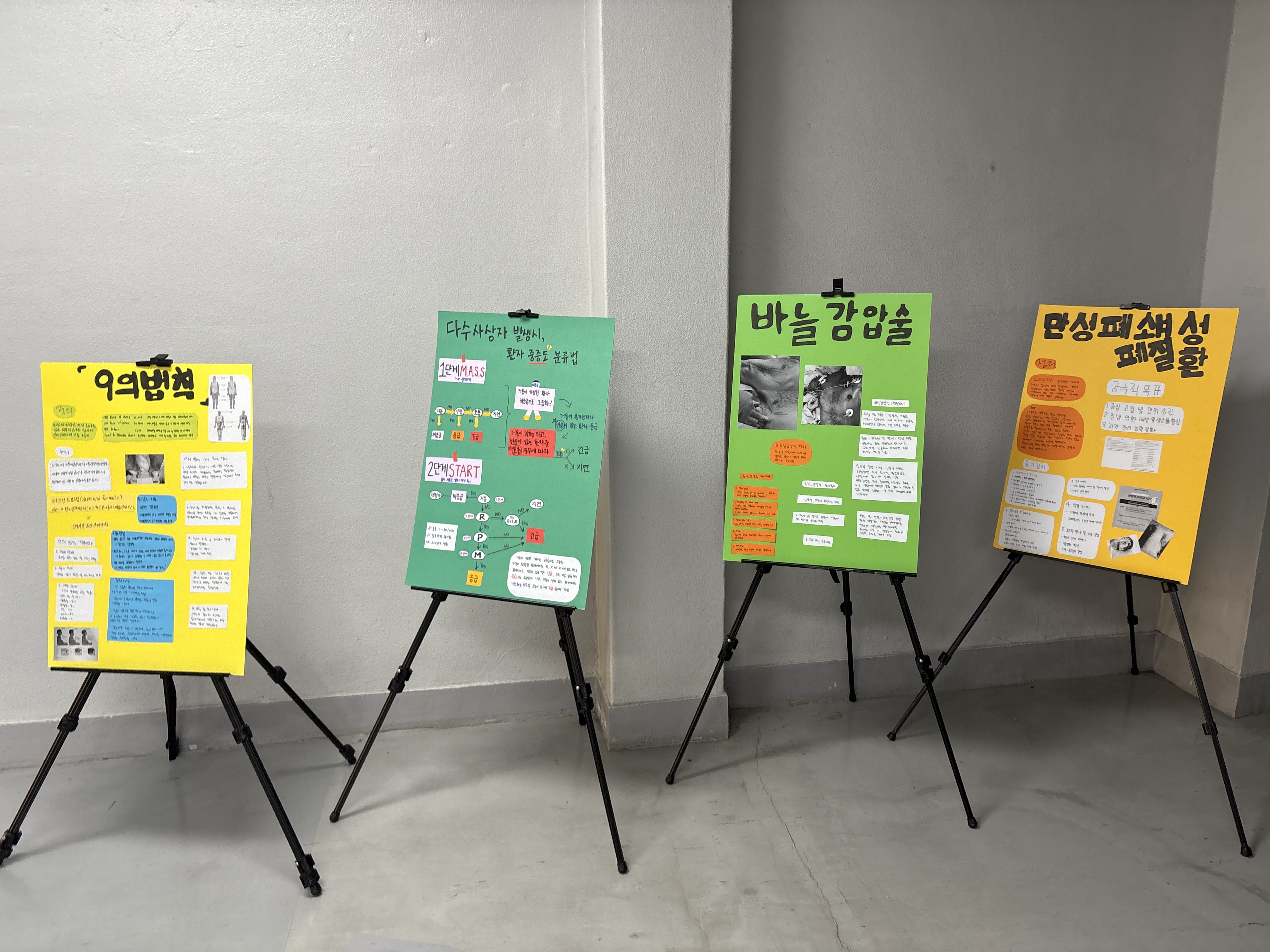 4부는 학술부원들이 제작하여 전시한 판넬 내용을 주제로 카훗퀴즈를 진행했습니다. 백일해, 9의법칙, 다수사상자 발생 시 환자 중증도 분류법, 바늘 감압술, 만성폐쇄성폐질환 등 다양한 전공지식을 정리할 수 있었습니다.
